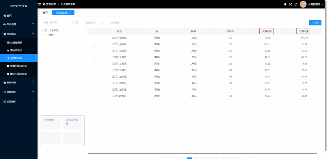5、可以完成各房间每月赠送电量的设定、学生转学、退学和毕业退费的结算;学生可以查询房间用电情况,显示电费余额,支持学生手机自助支付缴费购电等。