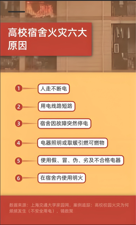 案例6 2024年4月9日中午,陕西省西安市西北大学长安校区女生宿舍楼突发火灾。校方工作人员回应,该事件没有造成学生受伤。