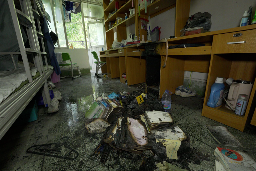 案例3 2024年9月2日,广东惠州一院校宿舍起火冒烟,接警后,消防立即赶赴现场处置,消防员到场时明火已被扑灭。经了解,发生事故的是一男生宿舍,宿管发现该宿舍冒烟起火后立即报警求助。该起火灾造成宿舍中的垃圾袋、书桌和部分书籍被烧毁。经现场勘验,起火点为书桌旁边垃圾袋起火,原因为烟头引燃垃圾袋内可燃物品;