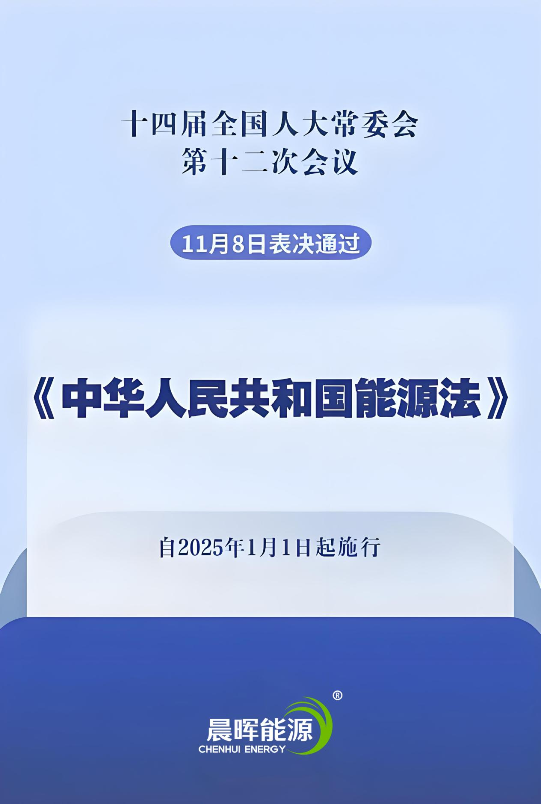 2024年11月8日,十四届全国人大常委会第十二次会议表决通过《中华人民共和国能源法》。自2025年1月1日起施行。
