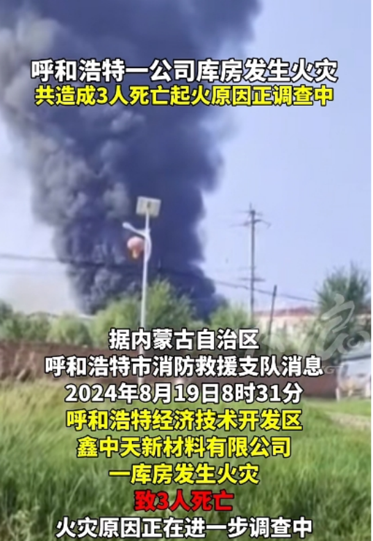 4、2024年8月19日8时31分, 内蒙古呼和浩特市经济技术开发区一材料公司库房发生火灾, 共造成3人死亡, 具体起火原因正在进一步调查中。