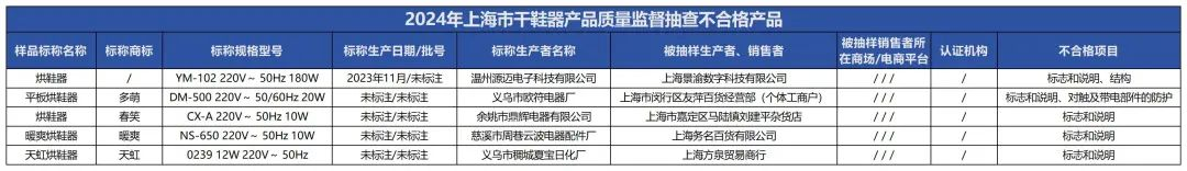 近期,上海市市场监督管理局依据SHSSXZ0209-2024《干鞋器上海市产品质量监督抽查实施细则》组织实施了对本市生产、销售的烘鞋器产品质量进行了监督抽查。本次抽查了10批次产品。经检验,不合格5批次。