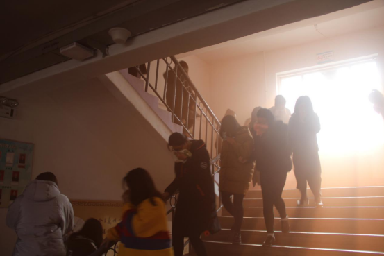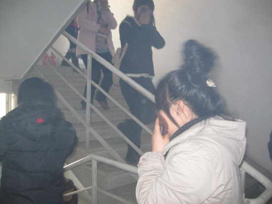 6、楼长从起火楼层开始,向上逐层通知学生疏散。通过吹哨和大声呼喊,通知学生迅速撤离房间;待通知到顶楼后,迅速返回五楼,然后逐层向下通知学生;各楼层导生和舍干在听到喊声后,立即通过敲打各寝室房门和呼喊,通知本楼层负责区域学生开始撤离房间,并用湿毛巾捂住口鼻,猫下腰来,按照疏散线路,做到有序疏散,要求学生不要快跑,有秩序地下楼;要熟悉路线,从各通道门迅速离开宿舍。