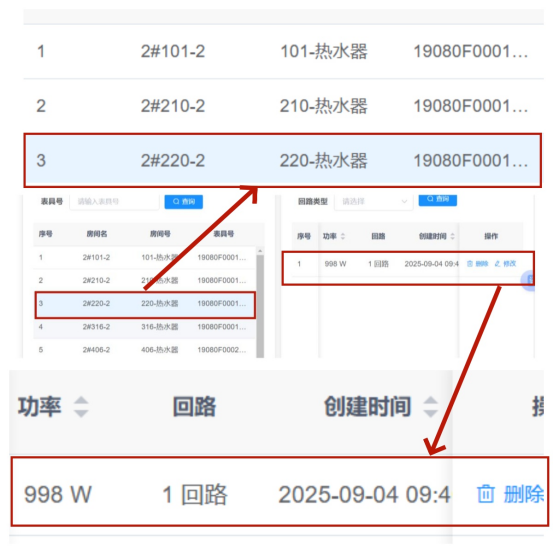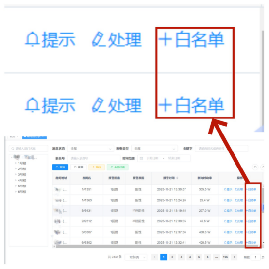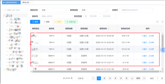 以安装“寓电安”智能控电系统的辽宁两所省属高校为例,宿舍内热水器、饮水机虽然为阻性大功率发热电器,但属于正常生活设施,允许学生使用,管理人员通过AI一键学习,即可把房间内热水器、饮水机录入合规电器白名单,保证学生正常使用不断电(见图1、图2);其他阻性发热电器如电热毯、电吹风、电饭锅等几十瓦至几千瓦的违禁电器还是无法使用,照样识别和断电。这样,既保障了宿舍用电安全,又极大方便了学校人性化管理。