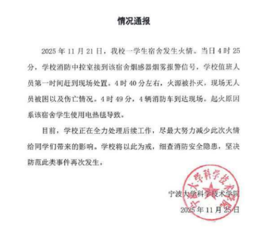 2025年11月21日凌晨,位于浙江慈溪的浙江某高校宿舍发生一起火灾。据校方通报,当日凌晨4时25分,学校消防中控室接收到该宿舍楼发出的火警信号,值班人员立即赶赴现场处置。 抵达现场后,值班人员发现宿舍内已有明显浓烟从门缝及窗户缝隙涌出,室内可见火光闪烁,火苗正从床铺位置迅速向上蔓延,引燃了被褥、衣物等可燃物,火势虽处于初起阶段,但发展迅猛,空气中弥漫着刺鼻的焦糊味。面对险情,值班人员果断使用就近的干粉灭火器对准火源根部喷射,并迅速切断电源,防止火势进一步扩大。