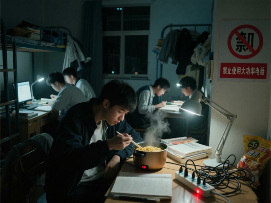 1、用火用电加大。备考期间,学生宿舍内各种电器使用频率显著增加。台灯长时间开启,私自使用电热毯、电热水袋等违禁电器,笔记本电脑、手机、充电宝等多台电子设备同时充电现象普遍存在,极易导致线路过热、短路、热失控起火。部分学生为节省时间,在宿舍违规使用“热得快”、电饭煲、电磁炉、电煮锅等大功率电器,更是埋下严重安全隐患。